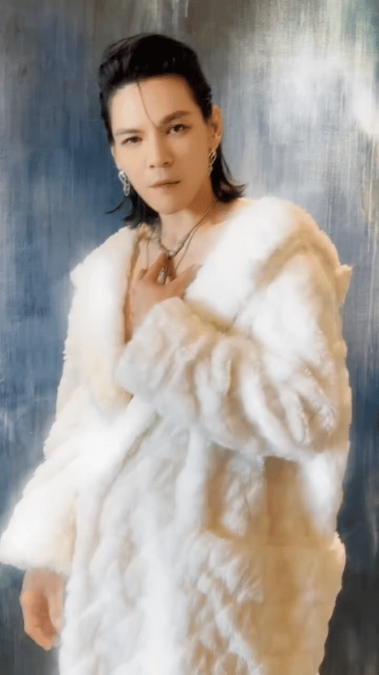视频里向佐穿着一件白色厚毛浴衣,梳着长发大背头,耳朵上戴着闪闪发亮耳坠,化着烟熏妆,露出背肌和胸肌,就差借向太几个大钻戒了。